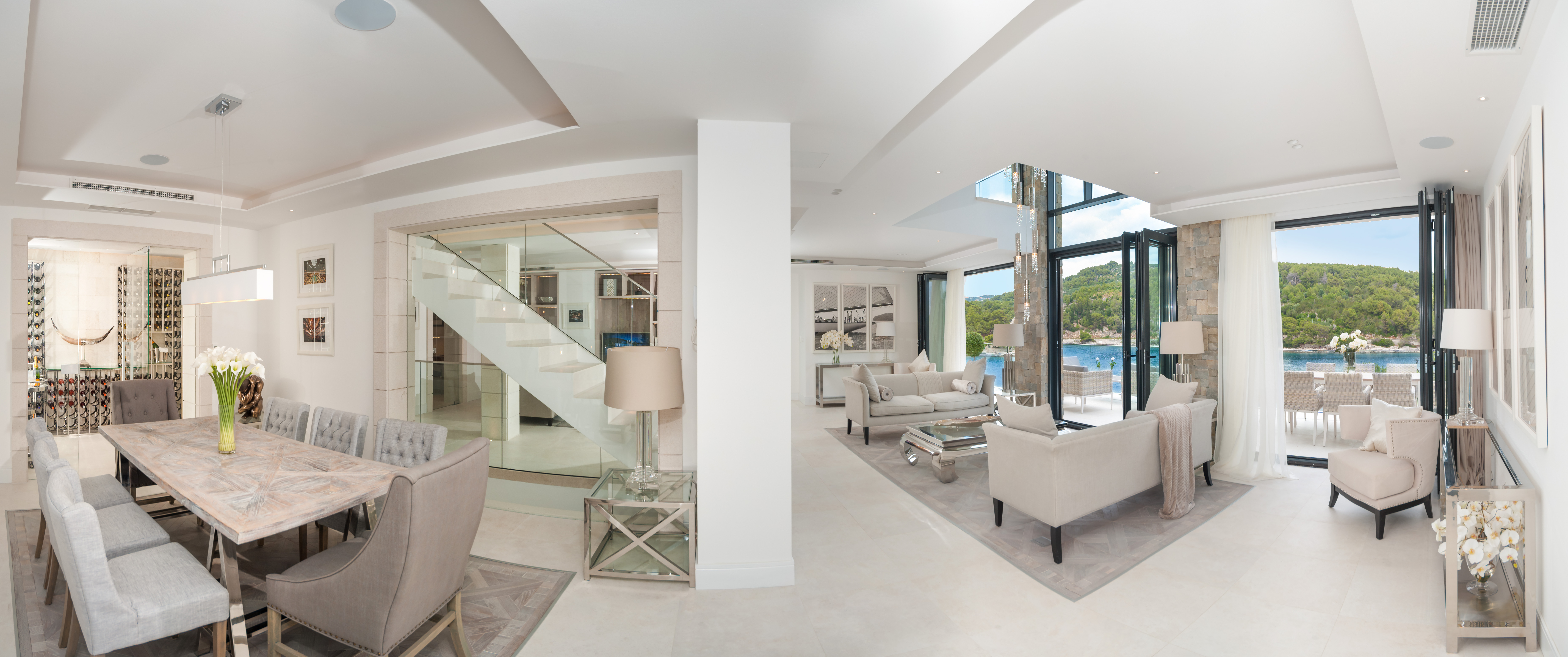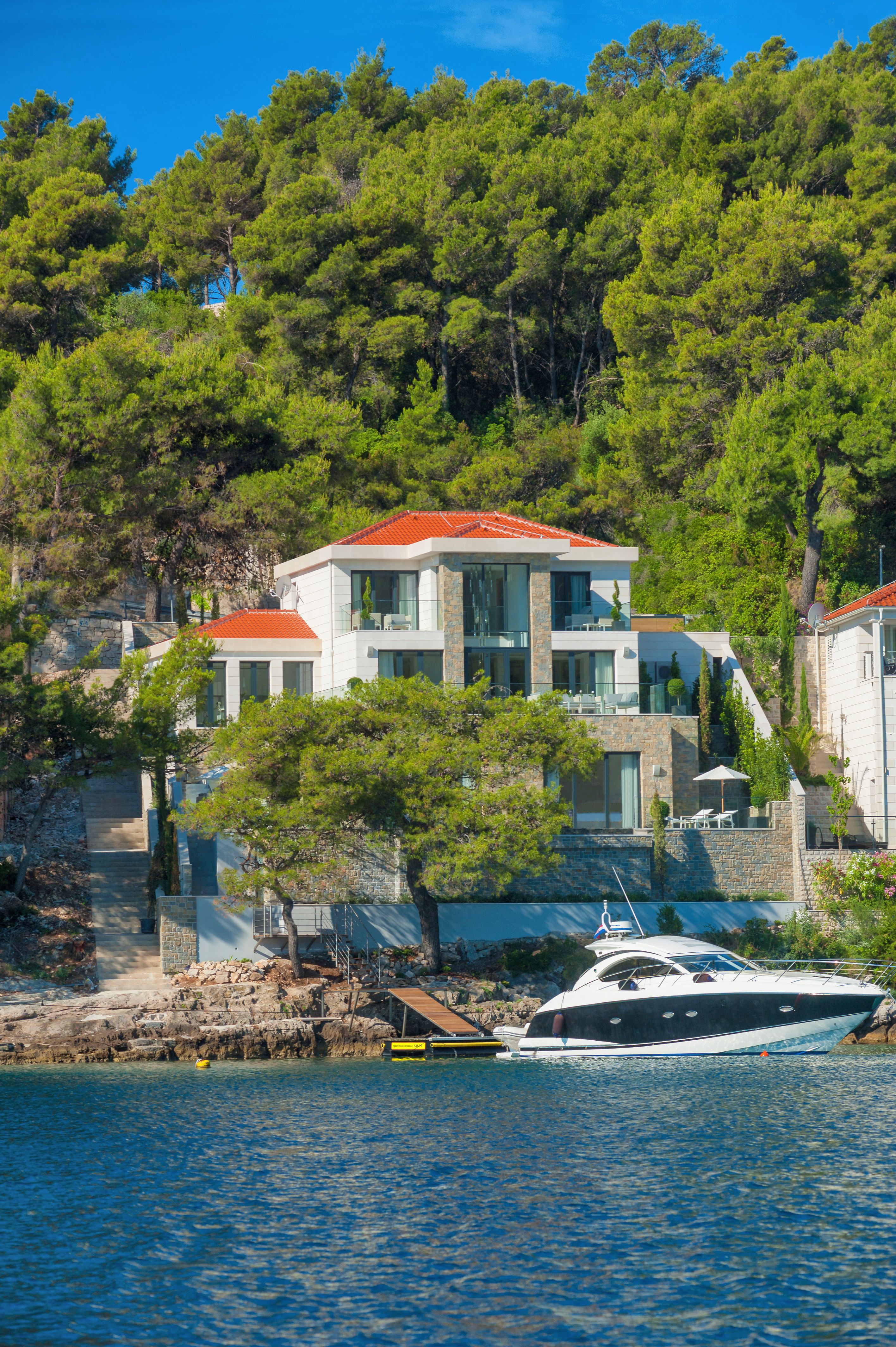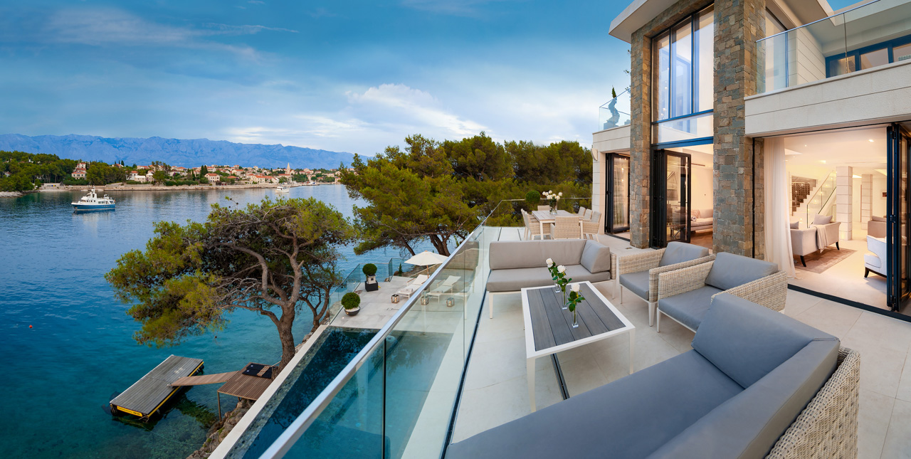 Villa Ivy is a spectacular waterfront property ingeniously designed directly on the water’s edge. Newly constructed on three levels the villa is an outstanding example of modern Dalmatian architecture. The house is luxurious and elegant and has been created using the best of everything, from the striking crystal chandeliers, to the finest stone sinks, beautiful fabrics and contemporary furnishings. Carefully thought out by an interior designer, every attention to detail and comfort has been considered. Built as a family home, a reflection of modern family attitudes, it has large and incredibly light and airy rooms opening on to extensive terraces, partly shaded, comfortably furnished and very well equipped for outdoor living. Created using the finest white Brac stone as seen on the American White house, villa Ivy is one of the few villas given a 5 star categorisation by the Croatian tourist board. Staffed with a house maid and villa host, this is a property in which guests can truly relax and be looked after from the moment they arrive.
