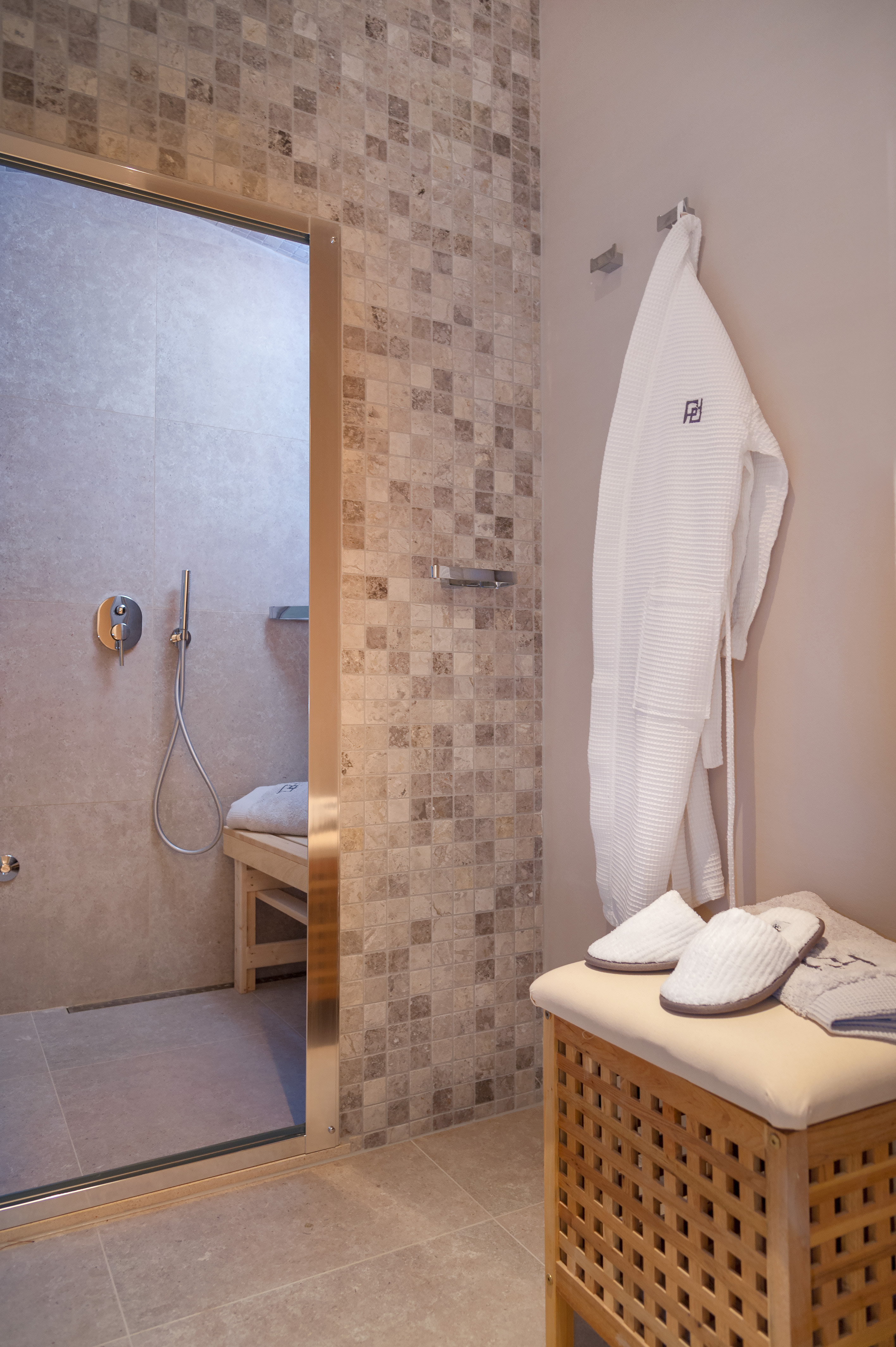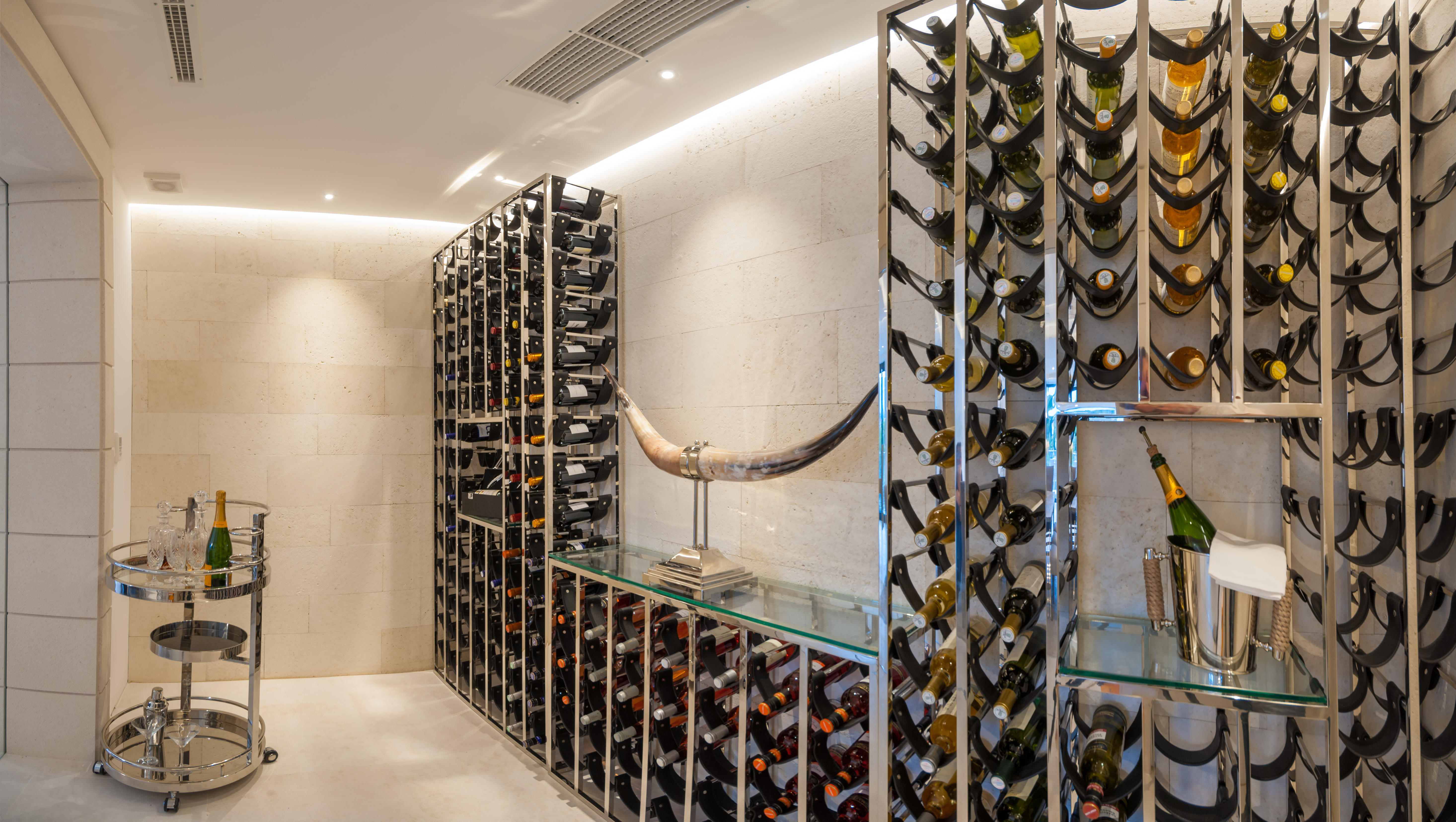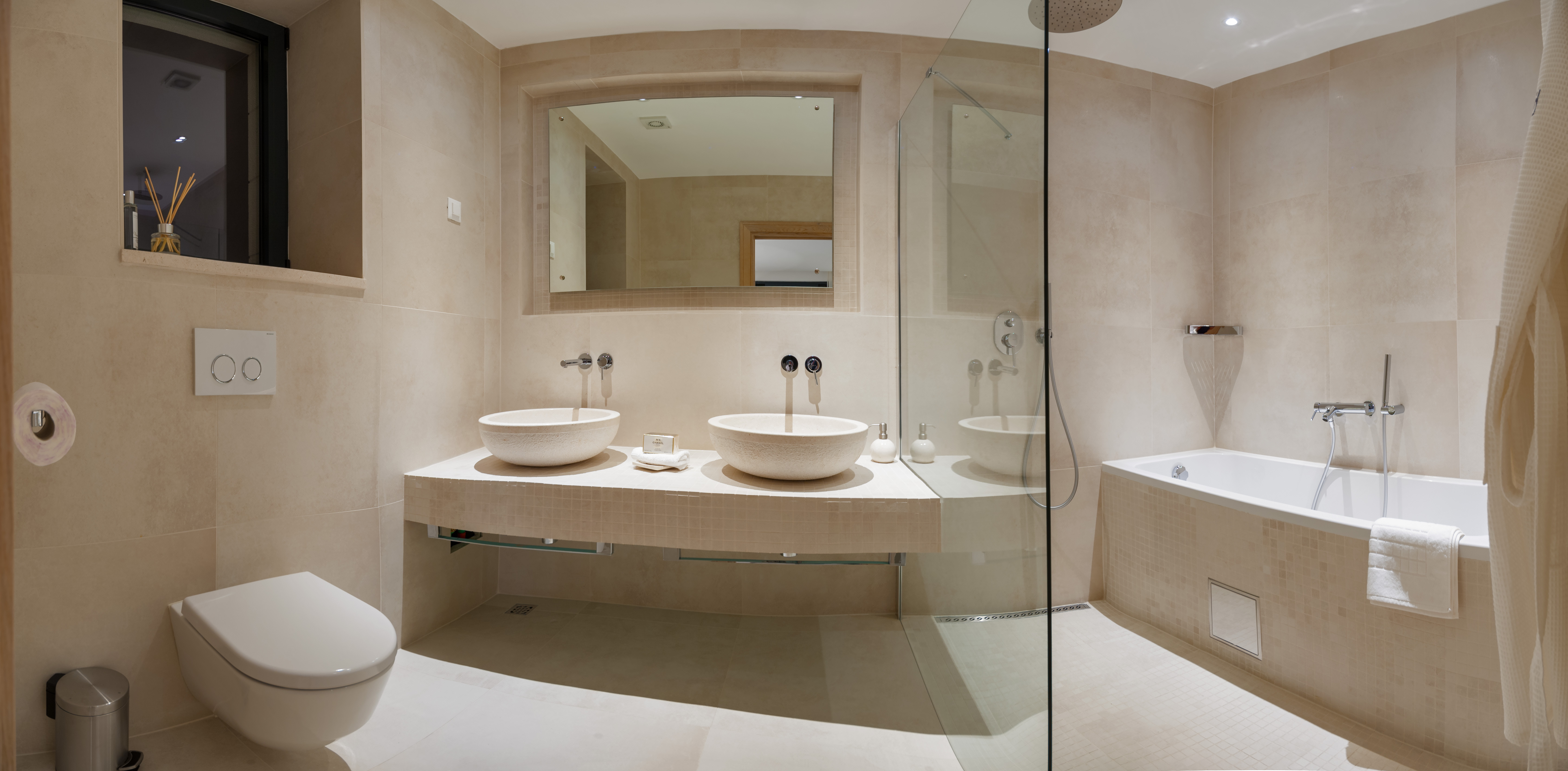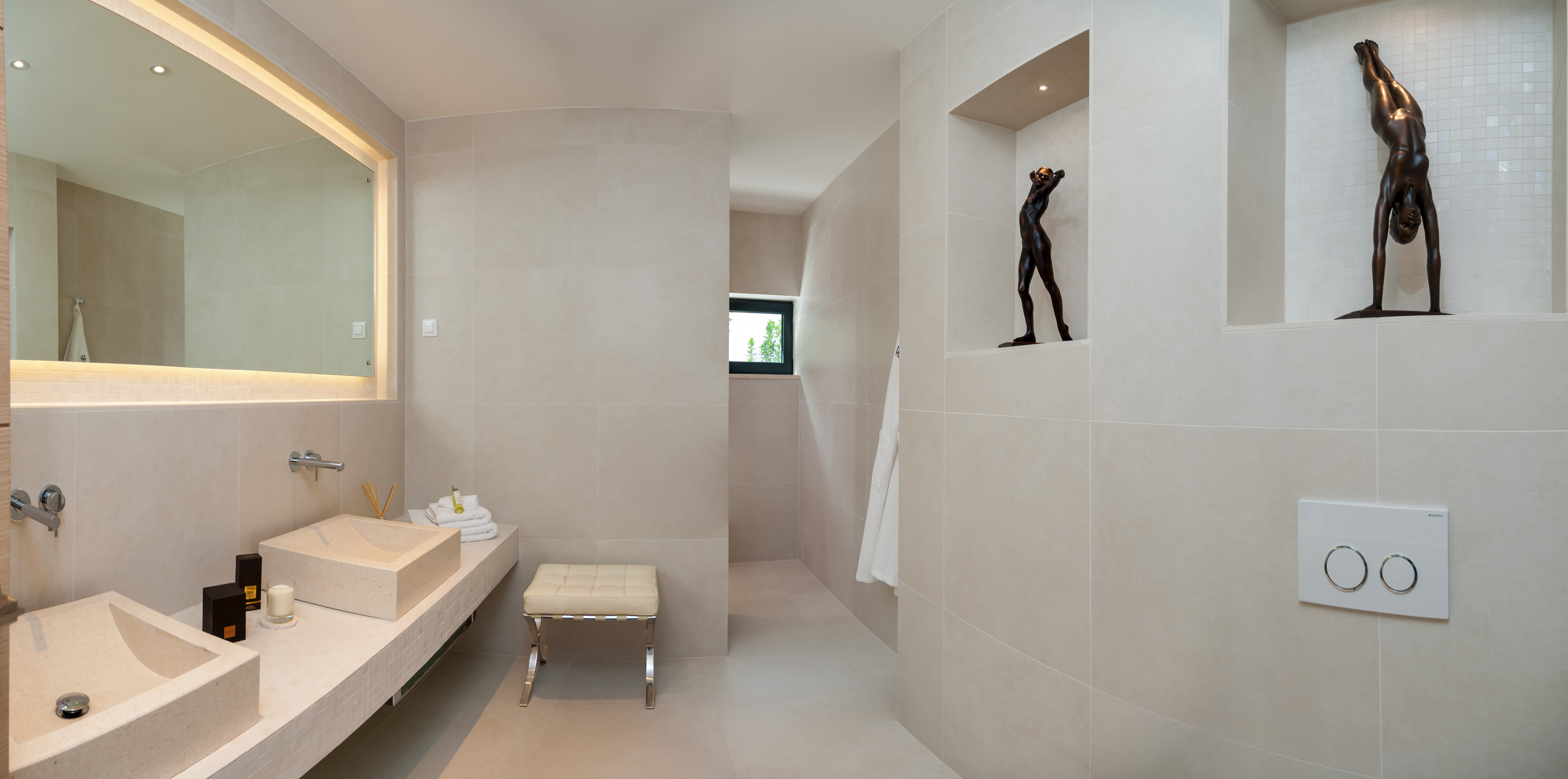 Entrance Level – The two master suits can be found off the main entrance hall. Both benefit from full height glass windows giving access to the stunning sea and mountain views. Blackout curtains open to let sunbeams flood the room with warm light. The beds themselves are king size and benefit from Egyptian cotton linens. Opposite the bed, the TV screen is linked to the central satellite. Both bedrooms have large private balconies with their own seating area allowing guests to take breakfast or just to escape to their own private domain. The bathrooms are a sublime exercise in understated opulence.