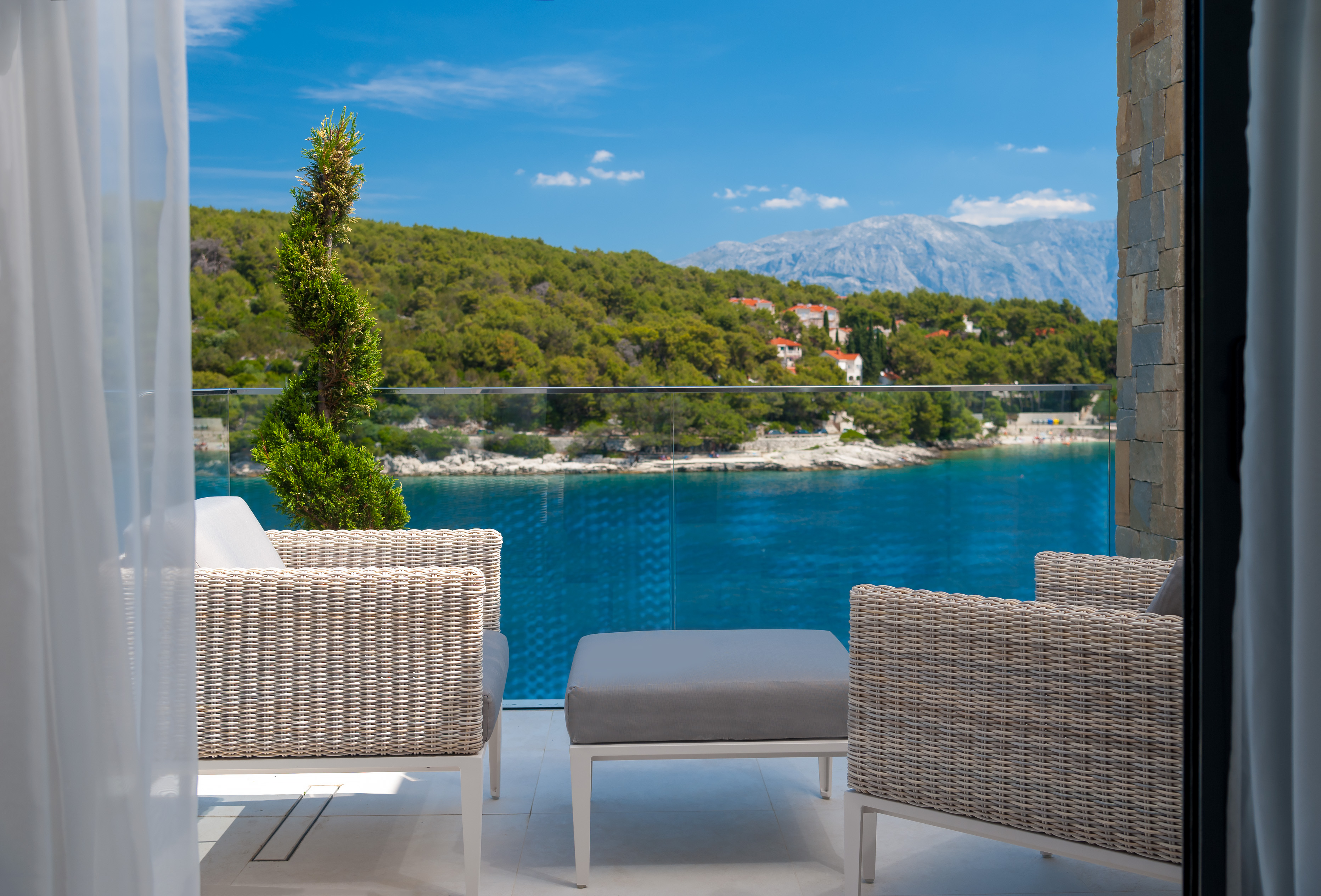 Individually and stylishly decorated with uncluttered elegance, all the bedrooms open out onto terraces with fabulous views over the bay of Sumartin and the Biokovo mountain range. Cushions, blinds and bedspreads are rich and textured, with silks and materials sourced from around the world. All the air-conditioned bedrooms have Egyptian cotton linens with opulent bathrooms and plenty of fluffy towels to pamper oneself with after a day in the sea or around the pool.