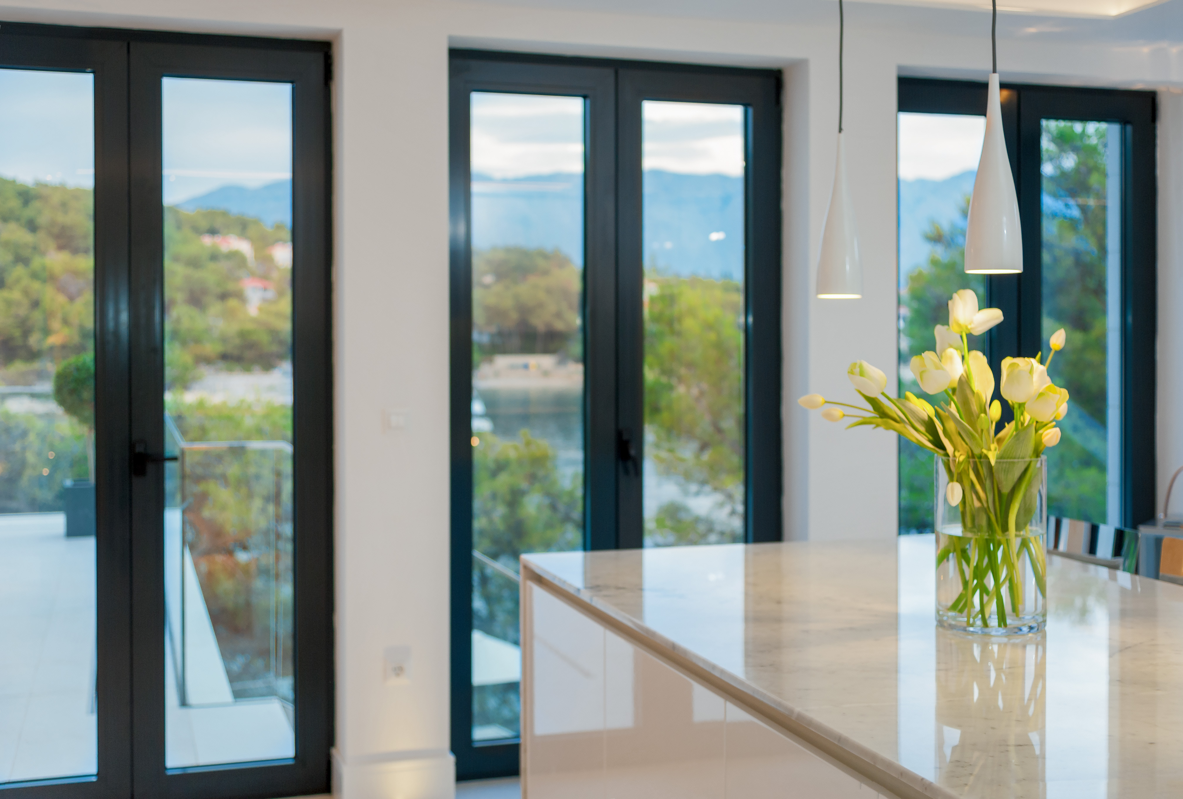 The stylish kitchen has uninterrupted views over the bay and holds all the gadgets needed to make cooking and hosting a pleasure. The living room combines contemporary furniture, artwork and sculpture mixed with antique and vintage pieces from France and India.